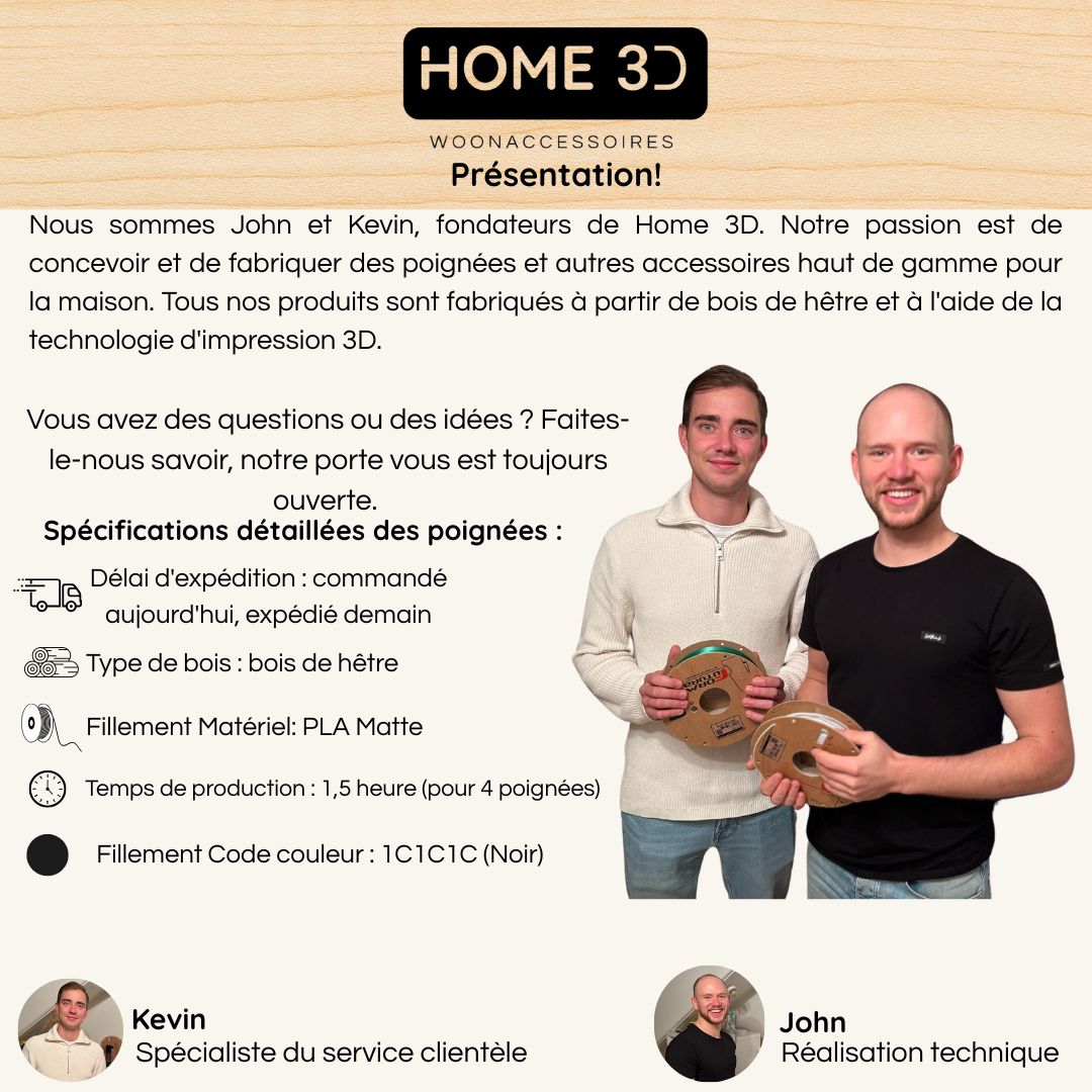 De nos jours, nous avons l’habitude de dire : commandé aujourd’hui, livré demain. Chez nous, c’est un peu différent. Nous ne produisons pas nos produits en masse, mais nous fabriquons chaque pièce sur mesure. Dans notre grenier, nous combinons la technologie moderne d’impression 3D avec le bois de hêtre traditionnel. Chaque pièce est sciée, poncée, percée et imprimée par nos soins, puis finie et contrôlée à la main.